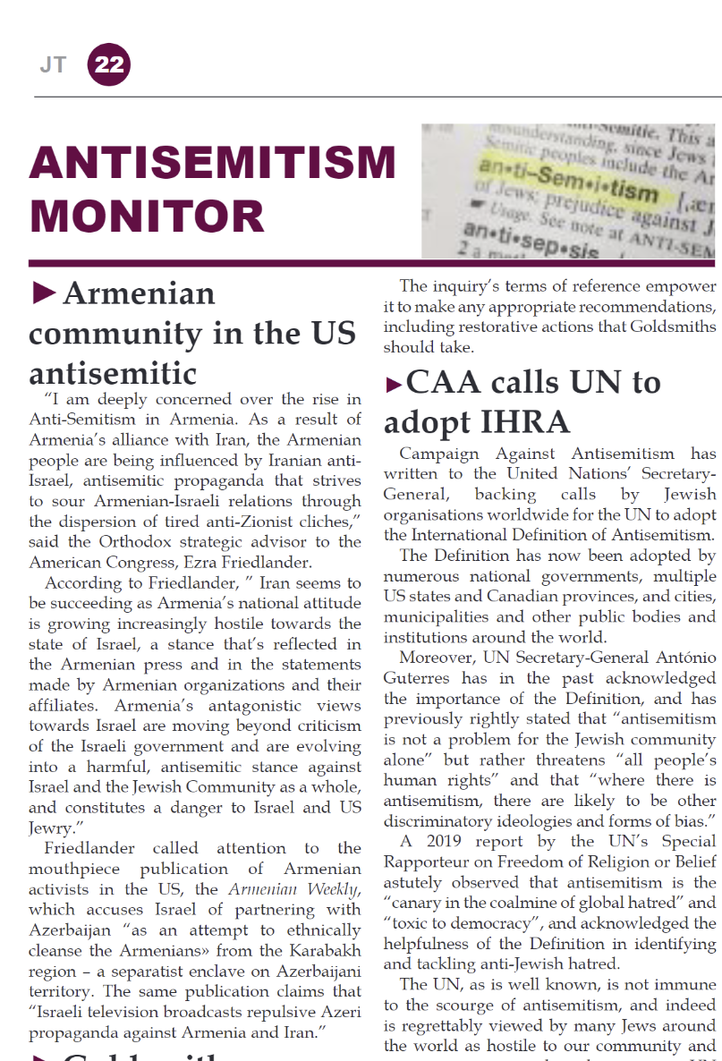 The Jewish Tribune практически еженедельно публикует данные мониторинга антисемитизма в различных странах мира. В последнем выпуске тема агрессивных нападок на евреев со стороны армянской общины США и граждан Армении была первой в обзоре.