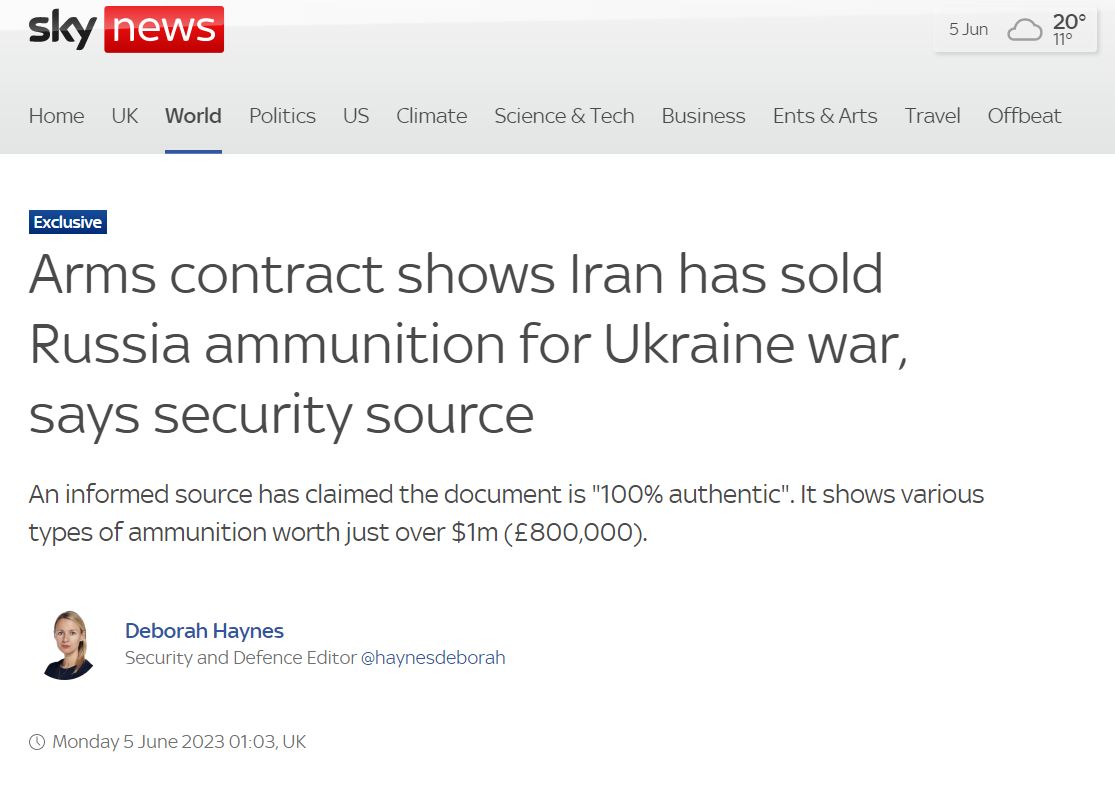 Британский новостной сайт Sky News, ссылаясь на своих источников в органах безопасности, сообщает, что 16-страничный документ от 14 сентября 2022 г. по продаже Ираном РФ вооружения является «на 100% подлинным». В нем указаны разного размера артиллерийские и танковые снаряды и ракеты на сумму более $1 млн.