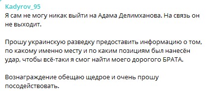 Глава Чечни Кадыров заявил, что никак не может выйти на связь со своим соратником и депутатом Адамом Делимхановым, раненым в Украине. Он просит украинскую разведку предоставить информацию, чтобы найти «дорогого брата» и обещает щедрое вознаграждение.
