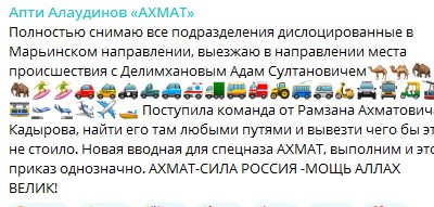 «Поступила команда от Рамзана Ахматовича Кадырова, найти его (Делимханова) там любыми путями и вывезти чего бы это не стоило», - написал командир чеченского батальона «Ахмат» Алаудинов в своем ТГ-канале, заявив, что отправляется на поиски раненого в Украине Делимханова. Незадолго до этого поста командир сообщал, что депутат жив и находится в Чечне.
