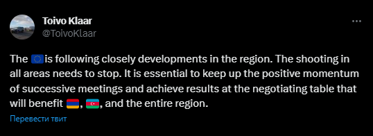 Спецпредставитель ЕС по Южному Кавказу Клаар выразил обеспокоенность нарушением режима прекращения огня между Азербайджаном и Арменией: «ЕС внимательно следит за тем, что происходит в регионе. Стрельба должна прекратиться во всех направлениях. Важно сохранить позитивную динамику последовательных встреч и достичь результатов за столом переговоров, которые принесут пользу Армении, Азербайджану и всему региону» (Twitter-аккаунт Клаара).