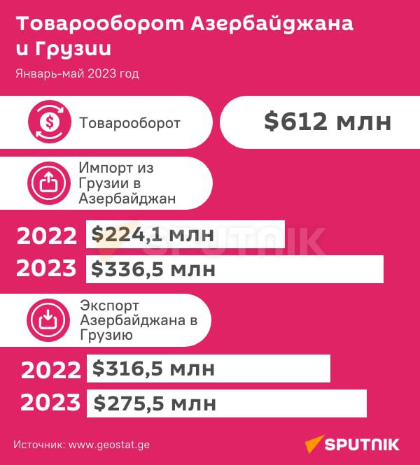 🇦🇿🇬🇪 Азербайджан по итогам января-мая 2023 г. вошел в пятерку главных торговых партнеров Грузии. Сюда также входят Турция, Россия, Китай и США. Общий внешнеторговый оборот Грузии за 5 месяцев достиг уровня более $8,3 млрд, что на 18,9% больше показателя за аналогичный период 2022 г. (Sputnik Грузия).