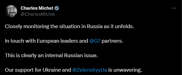 🇪🇺🇷🇺🇺🇦 Глава Европейского совета Мишель: «Внимательно следим за развитием ситуации в России... Это явно внутренняя проблема России. Наша поддержка Украины и Зеленского непоколебима».
