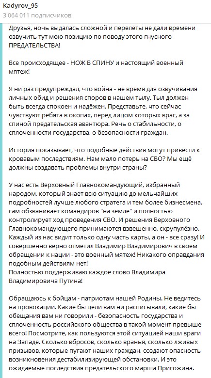 Глава Чечни обратился к бойцам российской армии с призывом не вестись на провокации. "Происходящее - это не ультиматум Министерству обороны. Это вызов государству, и против этого вызова необходимо сплотиться всем вокруг национального лидера...Мятеж должен быть подавлен, и если для этого необходимо принять жёсткие меры, то мы готовы!