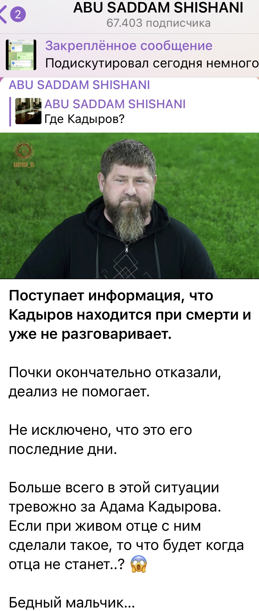 По сообщениям оппозиционных чеченских ТГ-каналов, глава Чечни Кадыров находится при смерти.