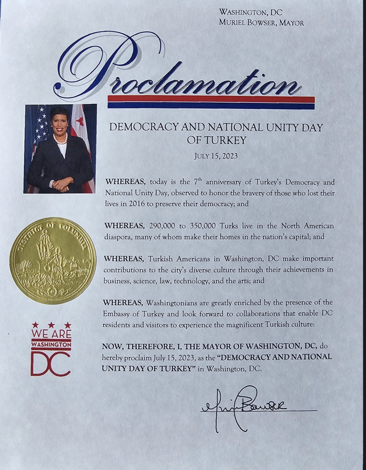 🇺🇸🇹🇷 Впервые в США мэр города Вашингтон провозгласила 15 июля Днем турецкой демократии и национального единства (Twitter-аккаунт Turkish American National Steering Committee).