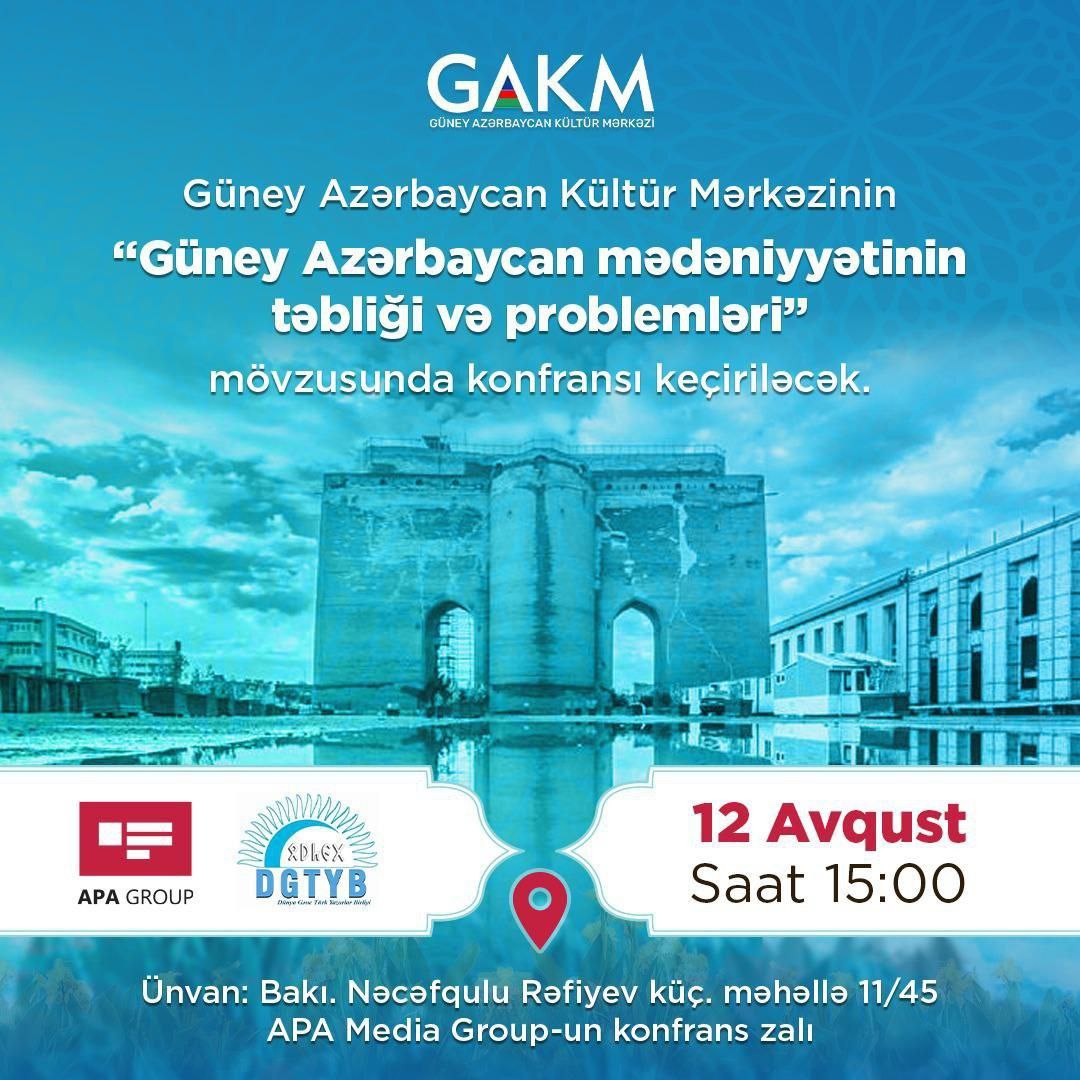 12 августа в Баку состоится конференция на тему «Популяризация культуры и проблемы Южного Азербайджана». Организатором конференции является Культурный Центр Южного Азербайджана, базирующийся в Турции (ТГ-канал Türk otağı).