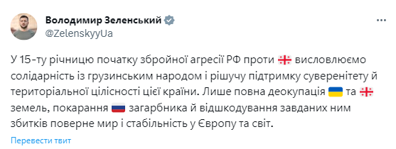🇺🇦🇬🇪 Президент Зеленский выразил солидарность с Грузией и подтвердил поддержку ее суверенитета в годовщину пятидневной войны с РФ в 2008 г. «Только полная деоккупация украинских и грузинских земель, наказание российского захватчика и возмещение нанесенного им ущерба вернет мир и стабильность в Европу и мир», - написал президент Украины в своем Twitter-аккаунте.