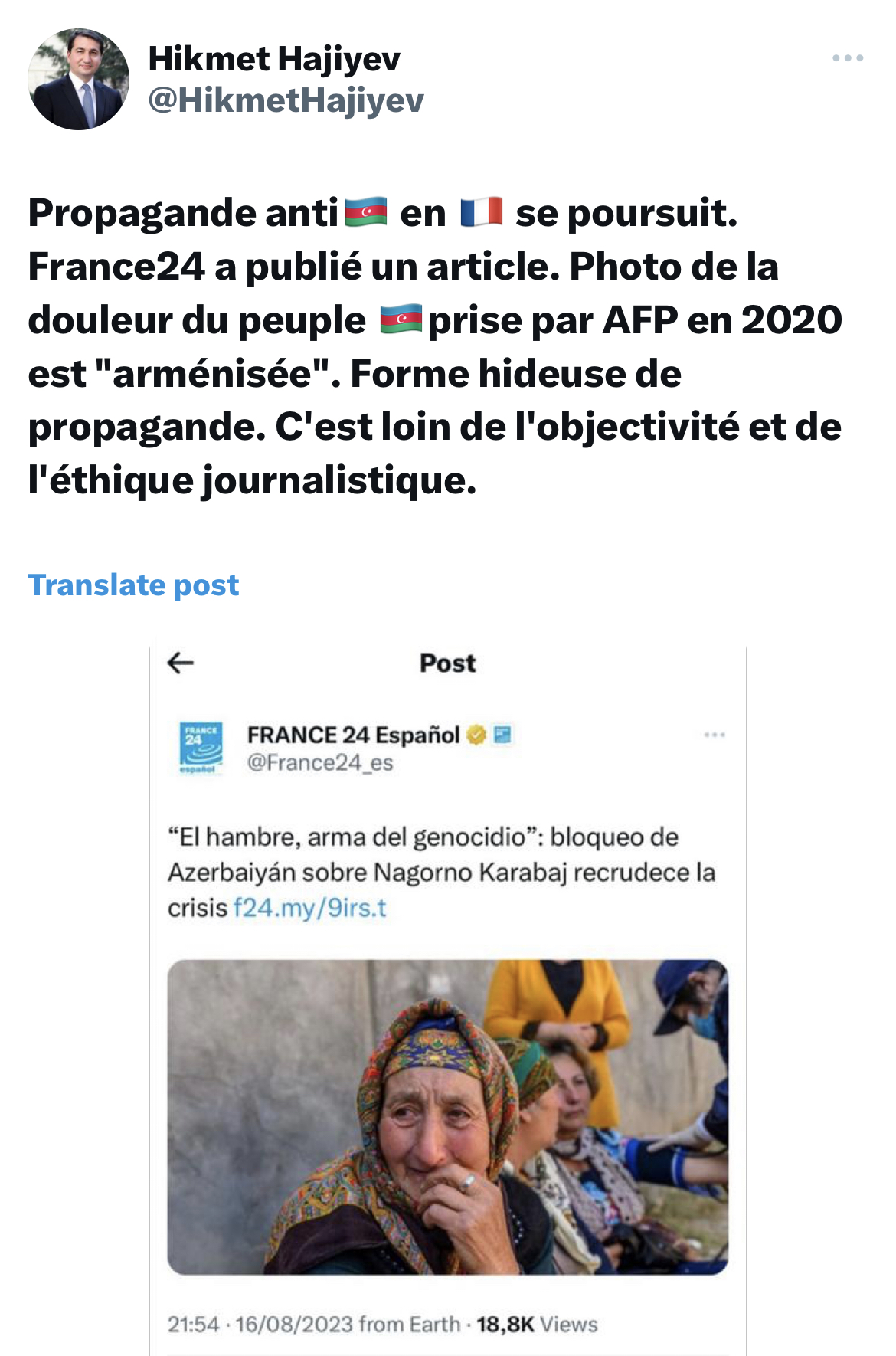 Французский телеканал France24 опубликовал антиазербайджанскую статью, где имеются фотографии, на которых якобы запечатлены армяне. Помощник президента Азербайджана, отреагировав на статью, отметил, что издание «арменизировало» данные фото.