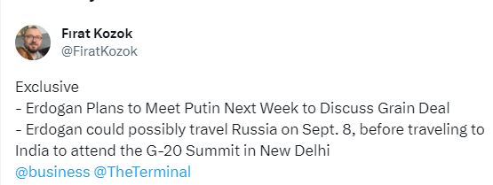 🇹🇷🇷🇺 8 сентября президент Эрдоган отправится в Москву для проведения встречи по зерновой сделке с Путиным, сообщил журналист Bloomberg.
