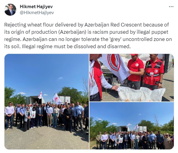 Помощник президента Азербайджана Гаджиев заявил, что отказ от муки, поставляемой азербайджанским обществом Красного Полумесяца, по причине ее происхождения (Азербайджан) является расизмом, «преследуемым незаконным марионеточным режимом».