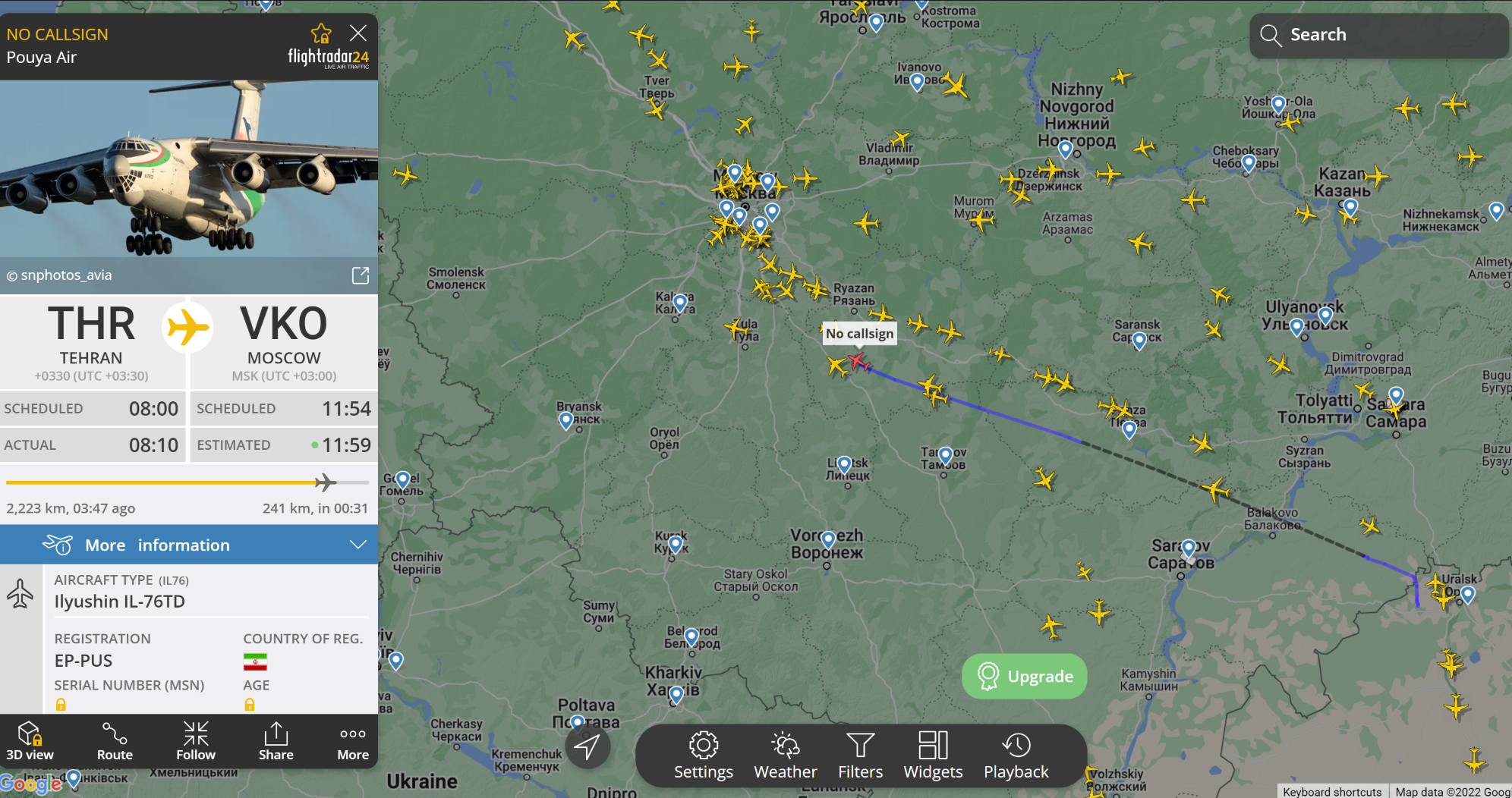 Самолет КСИР летит во Внуково. В данный момент из Тегерана в Москву летит грузовой самолет EP-PUS «Pouya Air» - иранской компании, принадлежащей КСИР.