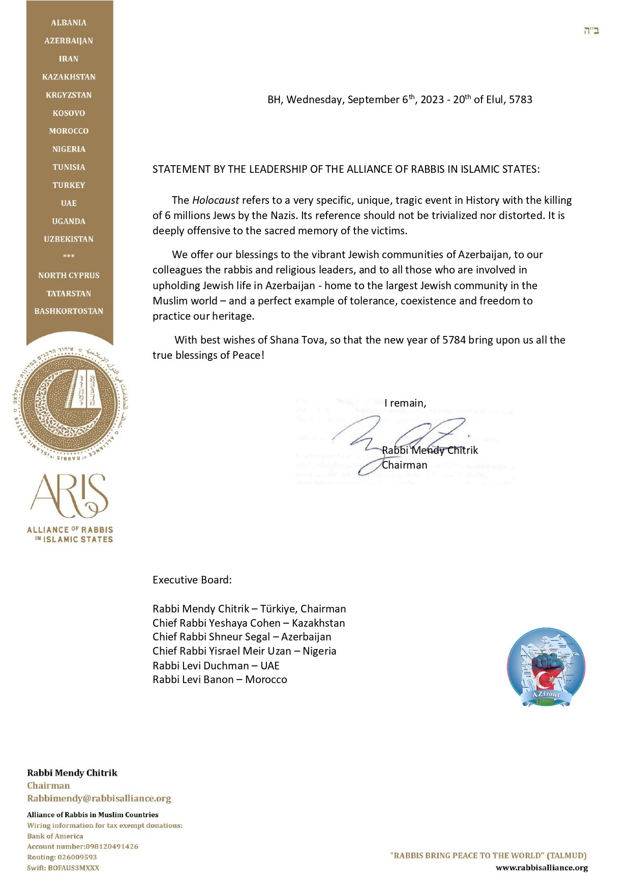 «Холокост - это очень конкретное, уникальное, трагическое событие в истории, связанное с убийством нацистами 6 миллионов евреев. Его упоминание не должно ни принижаться, ни искажаться. Это глубоко оскорбительно для священной памяти жертв», - отмечается в заявлении шести представителей организации Alliance of Rabbis in Islamic States. Документ подписан раввинами Турции, Казахстана, Азербайджана, ОАЭ, Марокко и Нигерии.