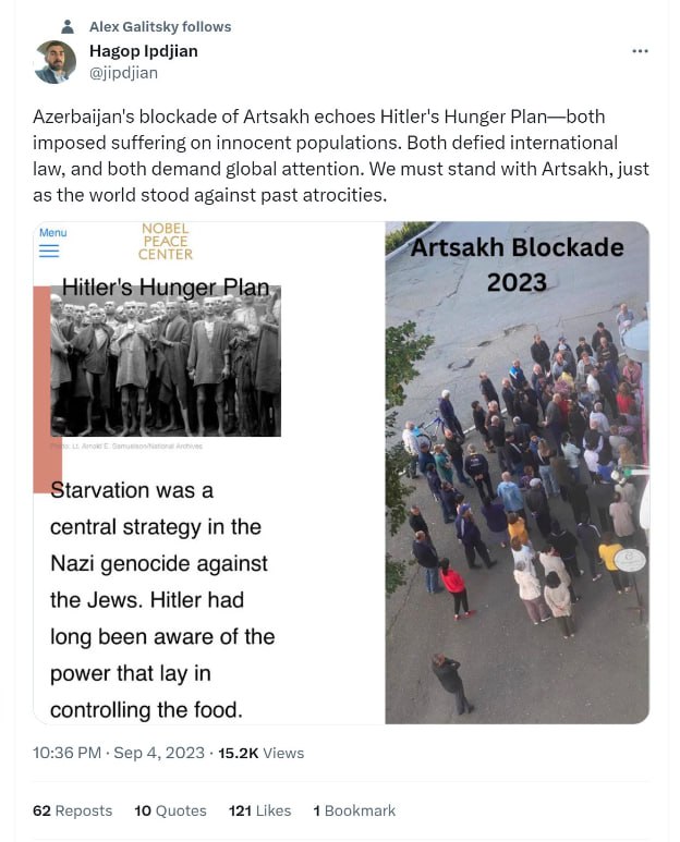 Бакинский раввин Замир Исаев в интервью израильской религиозной радиостанции Kol ba-Rama: «В последнее время мы являемся свидетелями явления, когда лидеры Армении… начали использовать формулировки, характерные для Холокоста и святые для каждого еврея. Они используют фотографии, сделанные во время Холокоста, сравнивают это с армянами, которые якобы переживают трудности, хотя это – не правда. Пользоваться терминами Холокоста, такими как «гетто», «геноцид», собственно «Холокост» - с нашей точки зрения, недопустимо! Как раз два дня назад один из армянских деятелей разместил у себя в Twitter две фотографии: армяне стоят посередине площадки, и евреи – в концентрационном лагере. И он сравнивает это, называя Азербайджан… нацистским режимом. Это – невыносимо! Поэтому мы выступили с протестом. Я специально записал видеообращение к раввинам во всем мире».