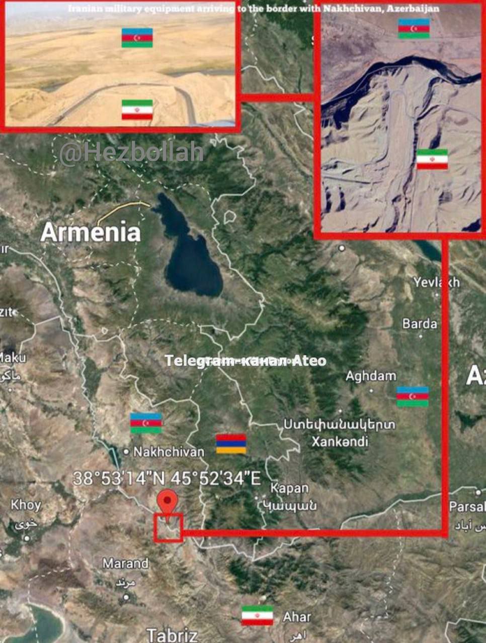 🇮🇷🇦🇿 Иран разместил свои ударные силы на границе с Азербайджаном. Об этом сообщает ТГ-канал проиранской военно-политической организации Хизбалла. На карте показано, что силы сосредоточены на границе со стороны Нахчыванской Автономной Республики Азербайджана.