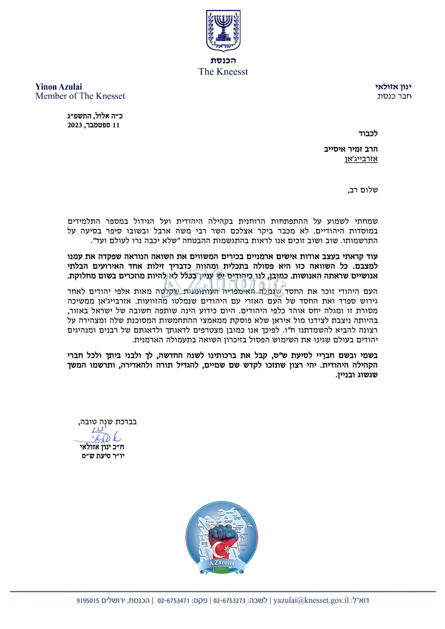 Азулай отмечает: «Еврейский народ помнит милосердие по отношению к себе Османской империи, которая приняла сотни тысяч евреев после изгнания из Испании (в конце XV в.), и милосердие азербайджанского народа по отношению к евреям, спасавшимся от ужасов (в период погромов в Российской империи в начале ХХ в. и во время Второй мировой войны). Азербайджан продолжает эту традицию, проявляя теплое отношение к евреям. Сегодня, как известно, это – важный партнер Израиля в регионе… Поэтому мы, безусловно, присоединяемся к Вашей озабоченности и беспокойству раввинов и еврейских лидеров в мире, осудивших недопустимое использование памяти Холокоста в армянской пропаганде».
