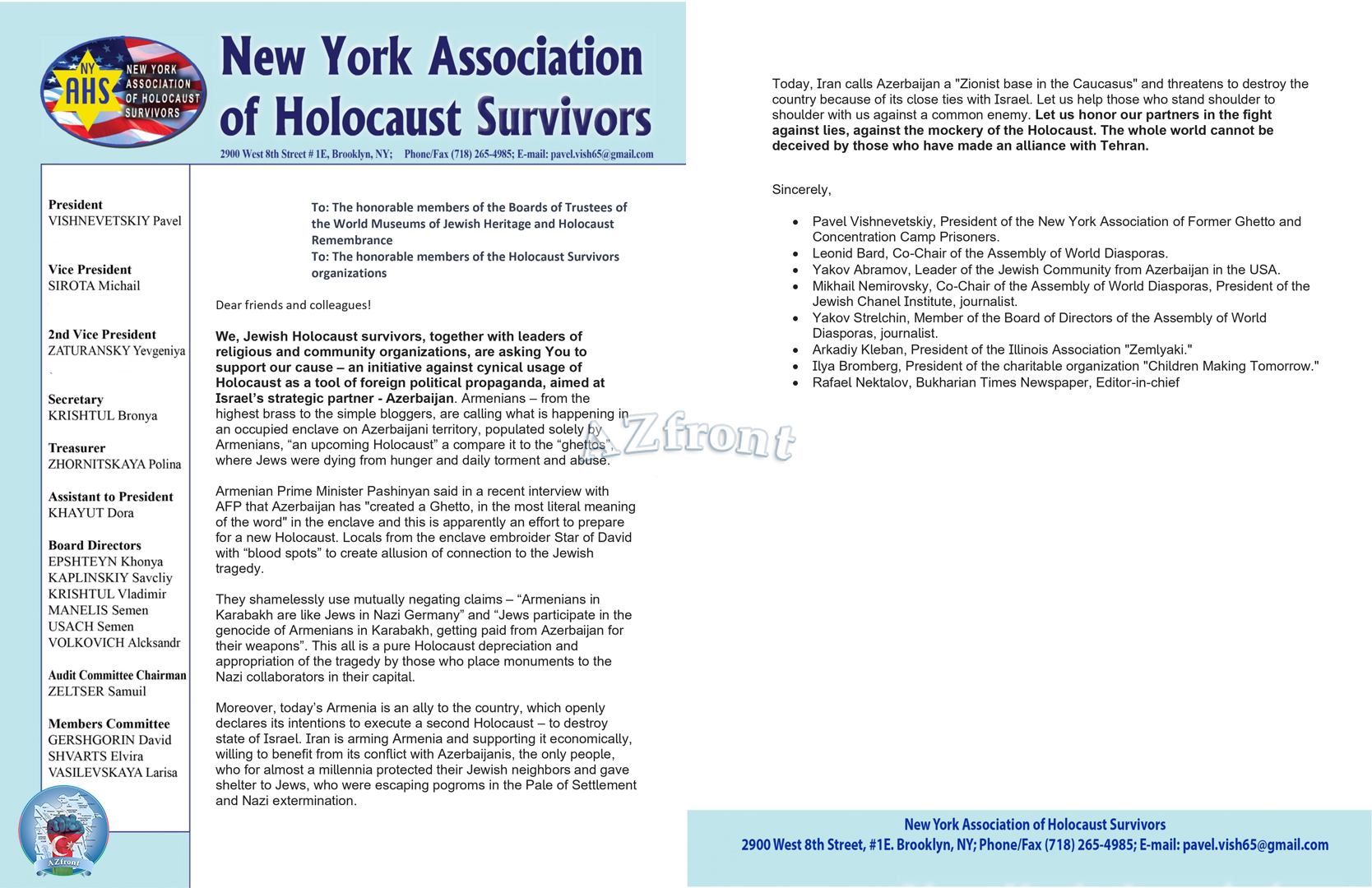 «Мы, евреи, пережившие Холокост, вместе с лидерами еврейских религиозных и общинных организаций, обращаемся к вам с просьбой поддержать наш дело – инициативу, направленную против циничного использования Холокоста в качестве инструмента внешнеполитической пропаганды, направленной против Азербайджана - стратегического партнера Израиля. Армяне – от высшего руководства до простых блоггеров – называют происходящее в оккупированном (ими) анклаве на территории Азербайджана, населенном армянами, "предстоящим Холокостом" и сравнивают его с «гетто», где евреи умирали от голода и ежедневных насилий и издевательств.