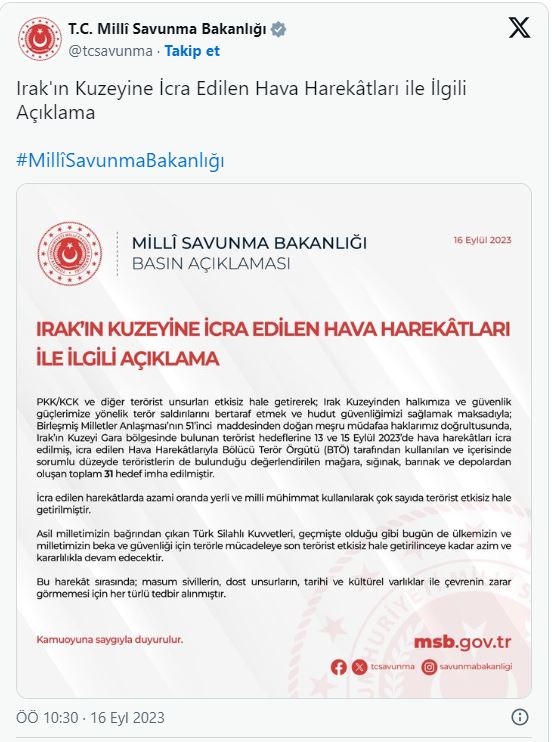 🇹🇷 Минобороны Турции: в результате воздушной операции, проведенной на севере Ирака 13-15 сентября, уничтожена 31 цель, состоящая из боевиков курдской террористической организации РКК, пещер и складов.