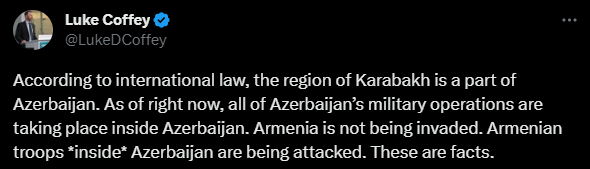 🇺🇸🇦🇿 «Согласно международному праву, Карабахский регион является частью Азербайджана. На данный момент все военные действия Азербайджана происходят внутри страны. Армения не подвергается вторжению. Нападениям подвергаются армянские войска, находящиеся "внутри" Азербайджана. Это факты» - заявил старший научный сотрудник Hudson Institute Коффи.