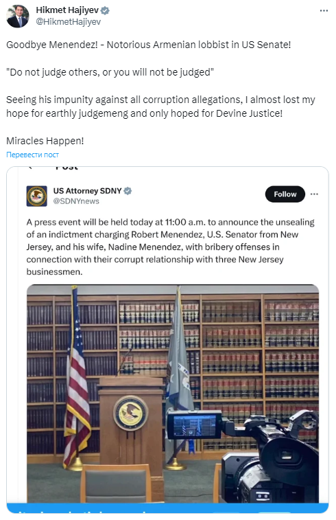 «Не судите других, и не будете судимы. Видя его безнаказанность в отношении всех обвинений в коррупции, я почти потерял надежду на земной суд и надеялся только на Божественную Справедливость! Чудеса случаются!» – написал помощник президента Азербайджана Гаджиев в своем Twitter-аккаунте в связи с предъявлением обвинений проармянскому сенатору США Роберту Менендесу.