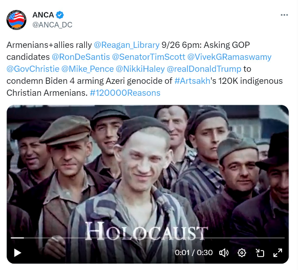 Armenian National Committee of America (ANCA) бесстыдно продолжает использовать Холокост - массовое уничтожение нацистами евреев, в пропагандистских целях, клеветнически утверждая, что точно такое же массовое уничтожение якобы происходит сейчас в Карабахе.