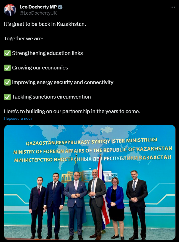 🇬🇧🇰🇿 Замглавы МИД Британии по вопросам Европы Дохерти находится в Казахстане. На повестке дня борьба с обходом антироссийских санкций и сотрудничество в энергетической сфере.