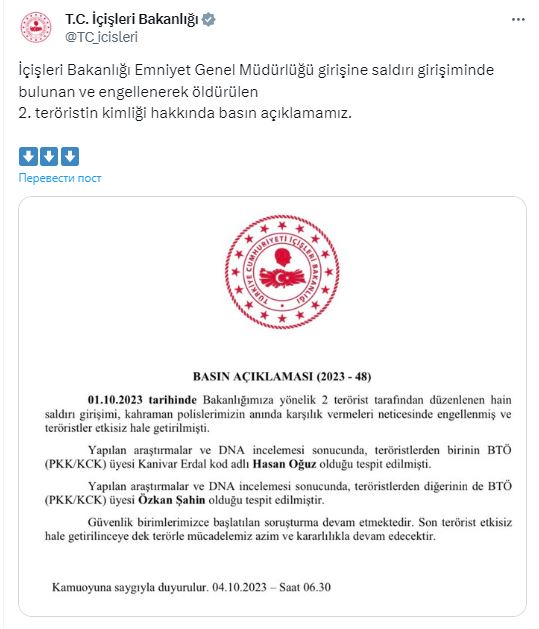 🇹🇷 МВД Турции установило личность смертника, подорвавшего себя у здания МВД в Анкаре 1 октября. Согласно заявлению ведомства, «в результате изучения ДНК установлено, что вторым террористом был Озкан Шахин», состоящий в курдской террористической организации РКК. Нейтрализованный силовиками другой террорист Хасан Огуз также являлся членом PKK.