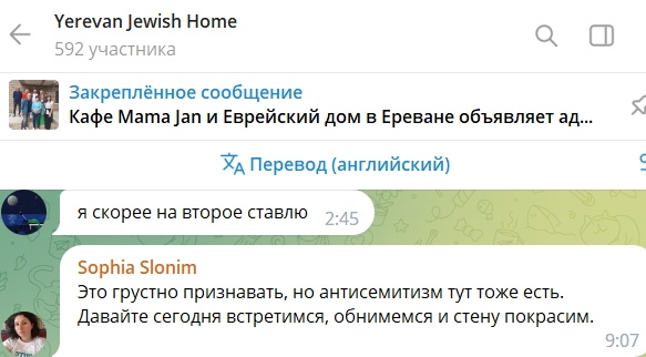 После нападения на единственную в Ереване синагогу Mordechai Navi представители местной еврейской общины вынуждены признать наличие в Армении антисемитизма. Так, одна из участниц группы Yerevan Jewish Home написала сегодня утром: «Это грустно признавать, но антисемитизм тут тоже есть». Хотя в течение второй половины сентября израильское министерство по делам диаспоры, государственное радио Израиля и тамошние «мозговые тресты» неоднократно отмечали рост антисемитизма в Армении. Указанное министерство предупреждало: «в социальных сетях Армении зафиксирован заметный рост антисемитской риторики, включавший также призывы к насильственным действиям в отношении евреев… есть опасения относительно исполнения этих призывов, или насильственных действий в отношении еврейского имущества в ближайшее время».