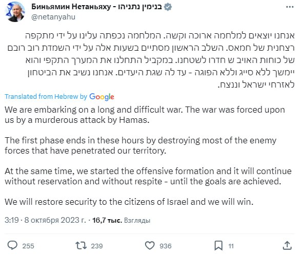 «Мы вступаем в долгую и трудную войну. К этой войне нас вынудило убийственное нападение ХАМАСа. Первая фаза завершается в эти часы уничтожением большей части сил противника, проникших на нашу территорию. Одновременно мы начали наступательное формирование, и оно будет продолжаться безоговорочно и без передышки - до тех пор, пока цели не будут достигнуты», - заявил премьер Израиля Нетаниягу в своем Twitter-аккаунте.