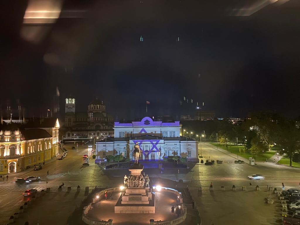 На здании парламента Болгарии проецируется флаг Израиля в знак солидарности.