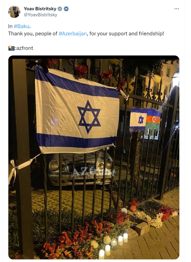 Заместитель посла Израиля в Азербайджане Быстрицкий также поблагодарил азербайджанцев за поддержку, разместив фотографию AZfront.
