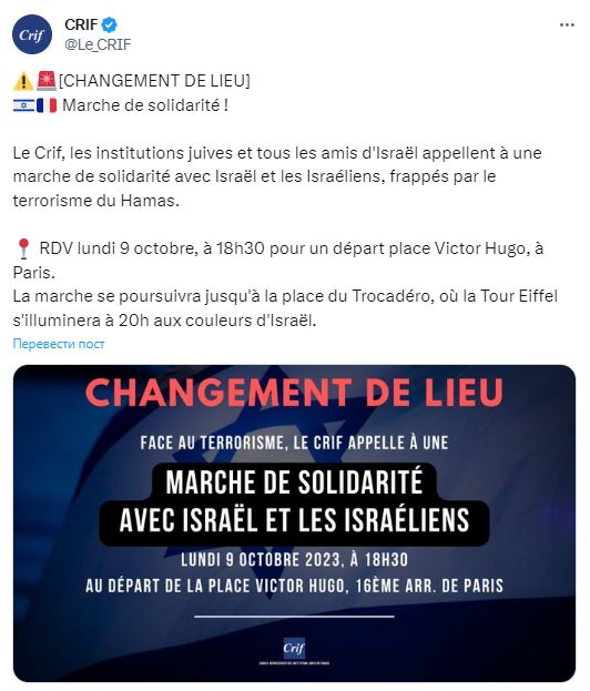 🇫🇷 Сегодня, 9 октября, в Париже состоится марш солидарности с израильтянами, пострадавшими от вторжения боевиков ХАМАСа и «Исламского джихада» на юг Израиля 7 октября. Марш, организатор которого Совет еврейских учреждений Франции (CRIF), начнется на площади Виктора Гюго и завершится около Эйфелевой башни. Последняя загорится цветами флага Израиля.