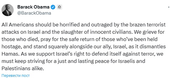 🇮🇱🇺🇸 Экс-президент США Обама: «Все американцы должны быть в ужасе и возмущены наглыми террористическими атаками на Израиль и убийствами невинных гражданских лиц. Мы скорбим о погибших, молимся за благополучное возвращение тех, кто оказался в заложниках, и поддерживаем нашего союзника Израиля в ликвидации ХАМАСа...».