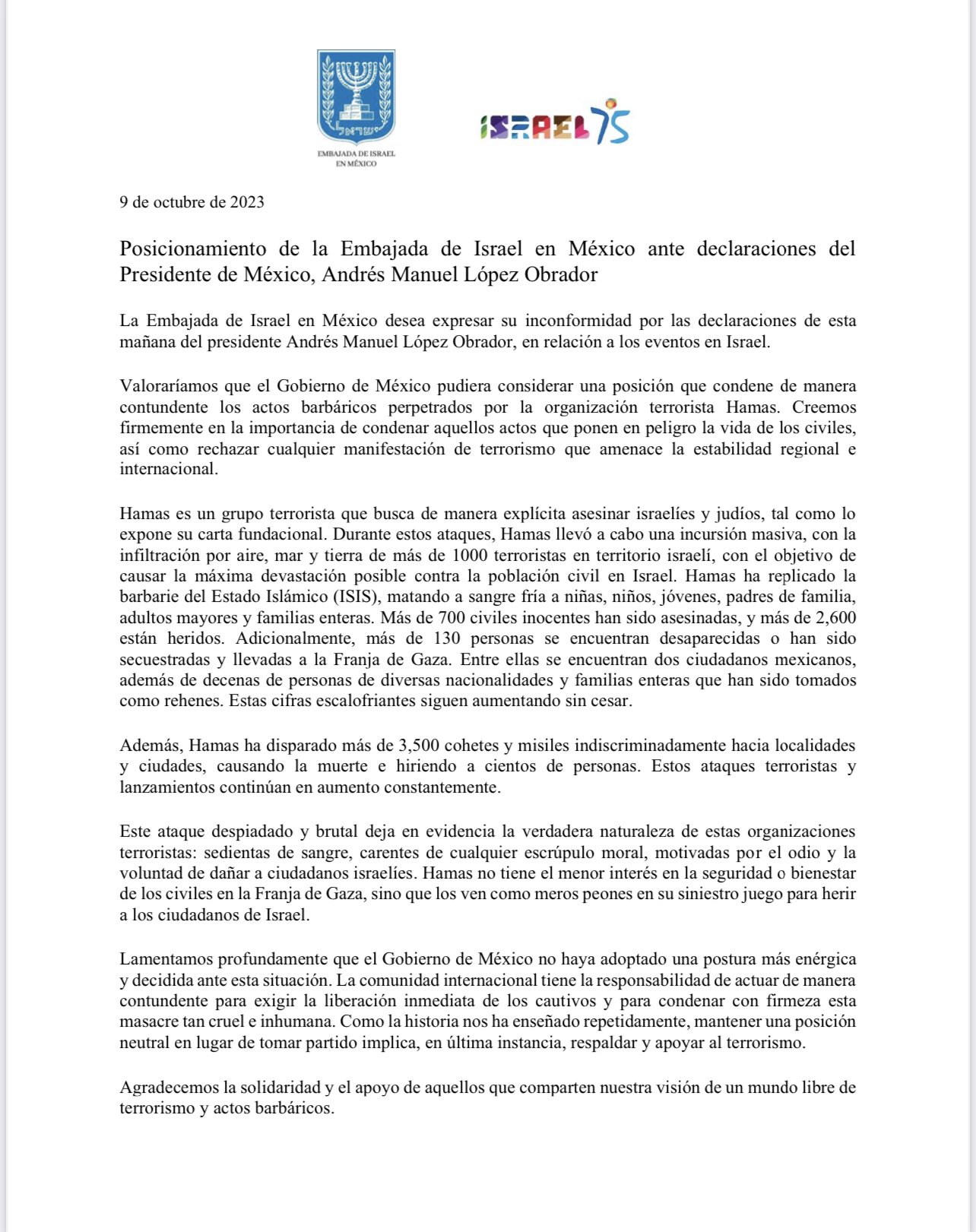 Посольство Израиля в Мексике раскритиковало заявление президента Мексики о нейтралитете в израильско-палестинском конфликте: «Сохранение нейтральной позиции вместо того, чтобы принимать чью-либо сторону, в конечном итоге означает одобрение и поддержку терроризма».