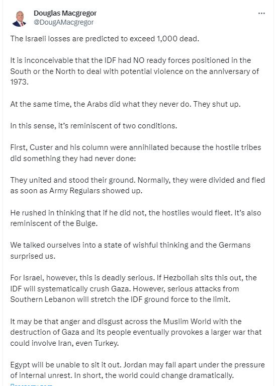 По мнению бывшего советника Пентагона Макгрегора, Израиль ответными действиями и в случае разрушения сектора Газа будет вовлечен в войну с Турцией и Ираном. «Если в официально начатую войну в качестве участников войдут Иран и Турция, следом за ними последует и Египет. В этом случае мир полностью изменится, и пока не представляется возможным говорить о том, какой исход будет у войны в Израиле и в каком статусе страна выйдет из него».