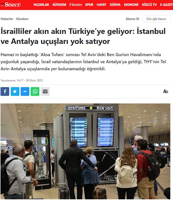 Sözcü: После россиян и украинцев израильтяне также начали стекаться в турецкие города Анталья и Стамбул. По данным издания, все рейсы из Израиля в Турцию заполнены.