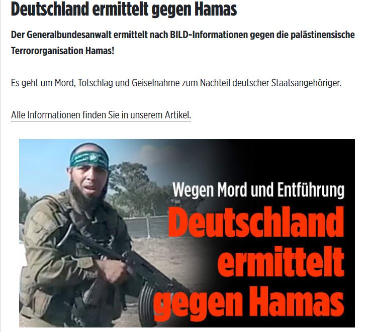 Bild: Генпрокуратура Германии начала расследование в отношении ХАМАСа по подозрению в убийствах и захвате немецких граждан. Поводом для расследования стали обращения к правительству Германии родственников убитых и захваченных, другие свидетельства таких актов, включая видеозаписи.