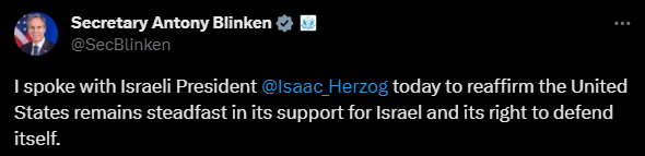 🇺🇸🇮🇱 Госсекретарь Блинкен по телефону подтвердил президенту Герцогу «неизменную поддержку» США Израилю.