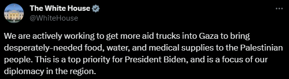 🇺🇸 Белый дом: «Мы активно работаем над тем, чтобы в Газу прибывало больше грузовиков с гумпомощью... Эта задача является одним из главных приоритетов президента Байдена...»