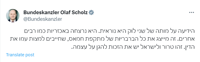 Канцлер Германии Шольц отреагировал на смерть захваченной боевиками ХАМАСа на юге Израиля гражданки ФРГ Шани Лук: «Она была зверски убита, как и многие другие. В этом проявляется все варварство нападения ХАМАСа, которое должно быть наказано. Это терроризм, и Израиль имеет право на самозащиту» (Twitter-аккаунт Шольца).