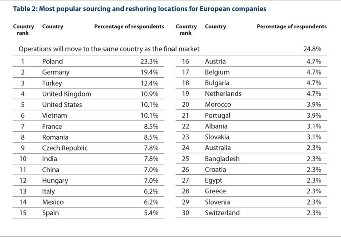 Турция находится на 3 месте среди стран, куда европейские компании перенаправляют свои производственные предприятия из Китая (закрытый для широкой публики совместный отчет Reuters-A.P. Moller - Maersk).