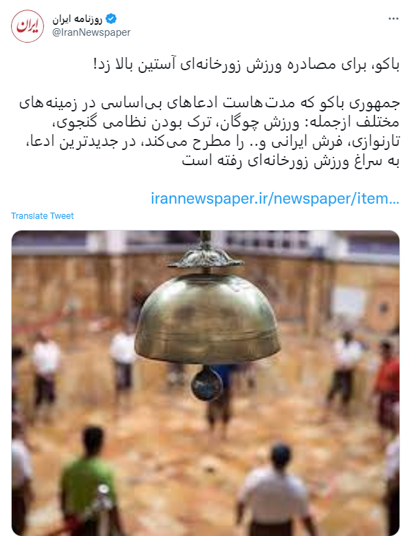 Официальная газета иранского правительства «Iran Newspaper» вновь опубликовала провокационный пост, назвав Азербайджан «Бакинской Республикой». Авторы статьи недовольны тем, что выдвинутая Азербайджаном номинация «Пехлеванство, традиционные игры «зорхана» и виды спорта» внесена в список нематериального культурного наследия человечества ЮНЕСКО.