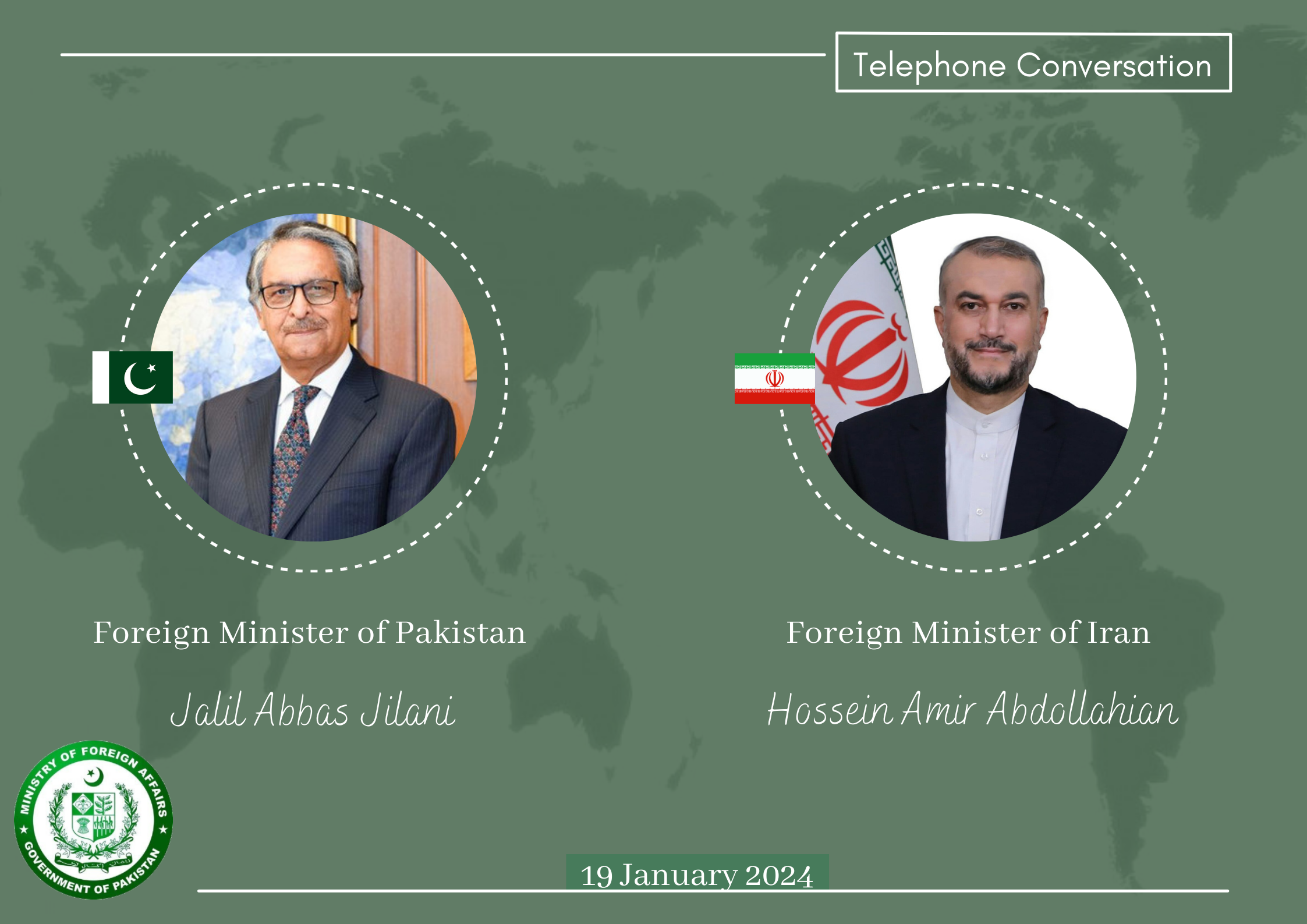 Сегодня, 19 января состоялся телефонный разговор главы МИД Пакистана Джилани с иранским коллегой Абдоллахияном. Министры договорились о возврате в ближайшее время послов двух стран (МИД Пакистана, МИД Ирана).