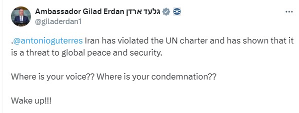«Иран нарушил устав ООН и продемонстрировал, что представляет угрозу глобальному миру и безопасности. Где ваш голос? Где ваше осуждение? Проснитесь!!!», - написал в своем Twitter-аккаунте посол Израиля в ООН Эрдан, обращаясь к генсеку организации Гутерришу.