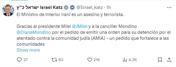 «Глава МВД Ирана - убийца и террорист. Спасибо президенту Хавьеру Милею и министру иностранных дел Диане Мондино за призыв выдать ордер на его арест за совершение нападения на еврейскую общину. Призыв укрепляет еврейские общины и семьи жертв, посылает четкий сигнал: свободный мир полон решимости остановить иранский террористический режим Хаменеи», - написал глава МИД Израиля Кац в своем Twitter-аккаунте.