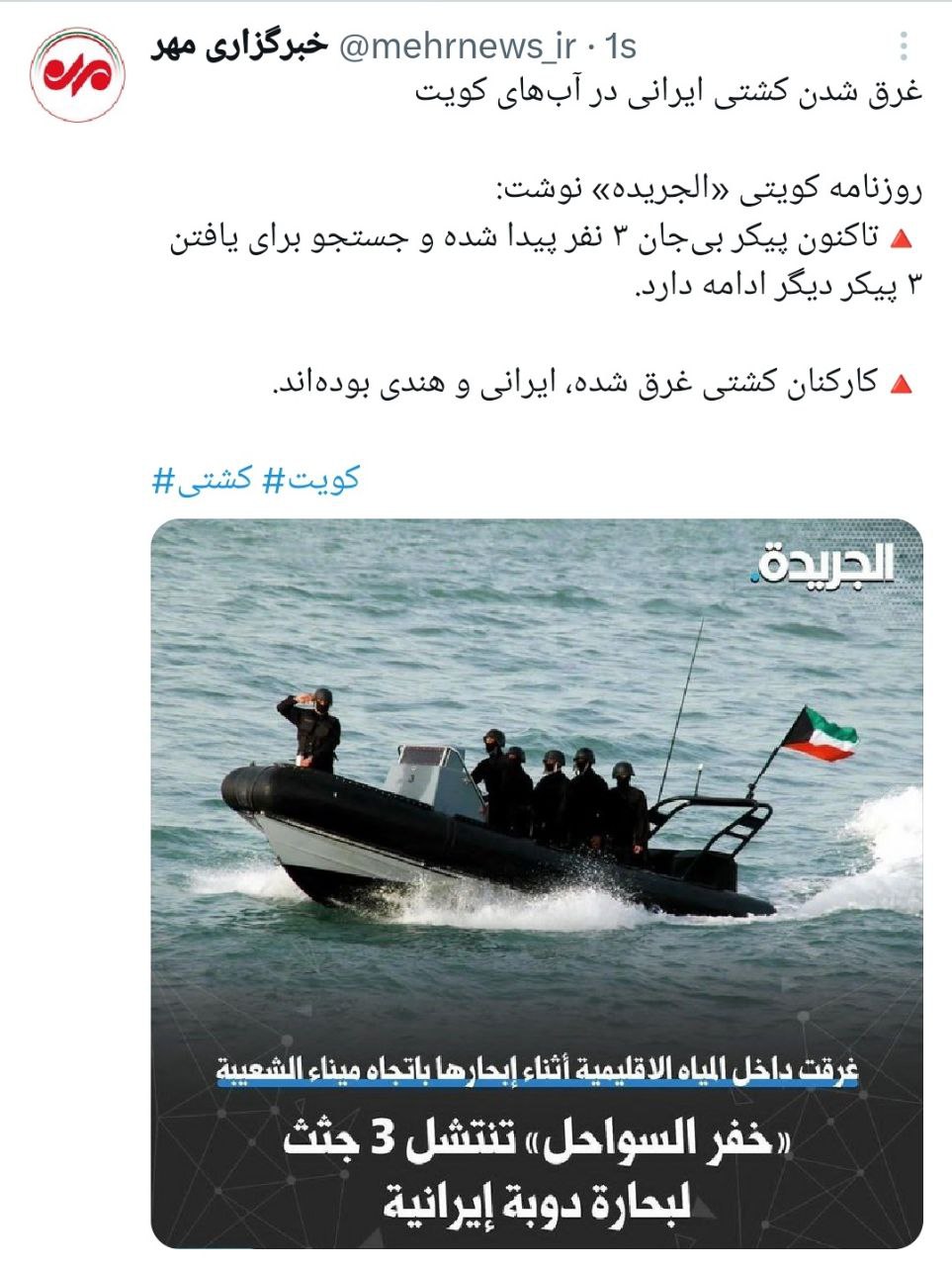 Иранское грузовое судно «Ara Bakhtar 1», экипаж которого состоял из 6 человек, 1 сентября потерпело крушение, затонув в территориальных водах Кувейта. Об этом сообщает иранское информагентство Mehr. «Среди экипажа затонувшего судна были граждане Ирана и Индии. Тела 3 человек найдены, поиски еще трех тел продолжаются», - заявил глава управления безопасности и береговой охраны Организации морского транспорта и портов Ирана Пасанде.