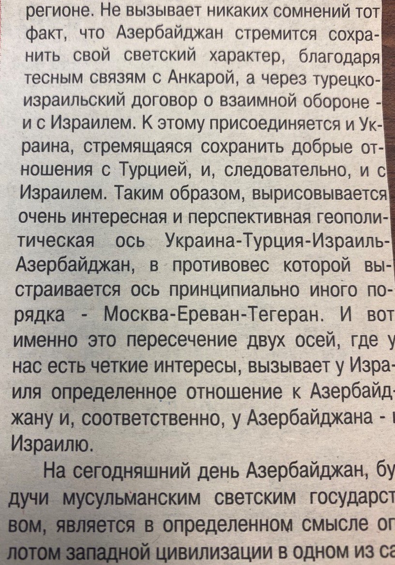 «…Азербайджан стремится сохранить свой светский характер, благодаря тесным связям с Анкарой, а через турецко-израильский договор о взаимной обороне – и с Израилем. К этому присоединяется и Украина, стремящаяся сохранить добрые отношения с Турцией, и, следовательно, и с Израилем. Таким образом, вырисовывается очень интересная и перспективная геополитическая ось Украина-Турция-Израиль-Азербайджан, в противовес которой выстраивается ось принципиально иного порядка – Москва-Ереван-Тегеран. И вот именно это пересечение двух осей, вызывает у Израиля определенное отношение к Азербайджану, у Азербайджана – к Израилю».