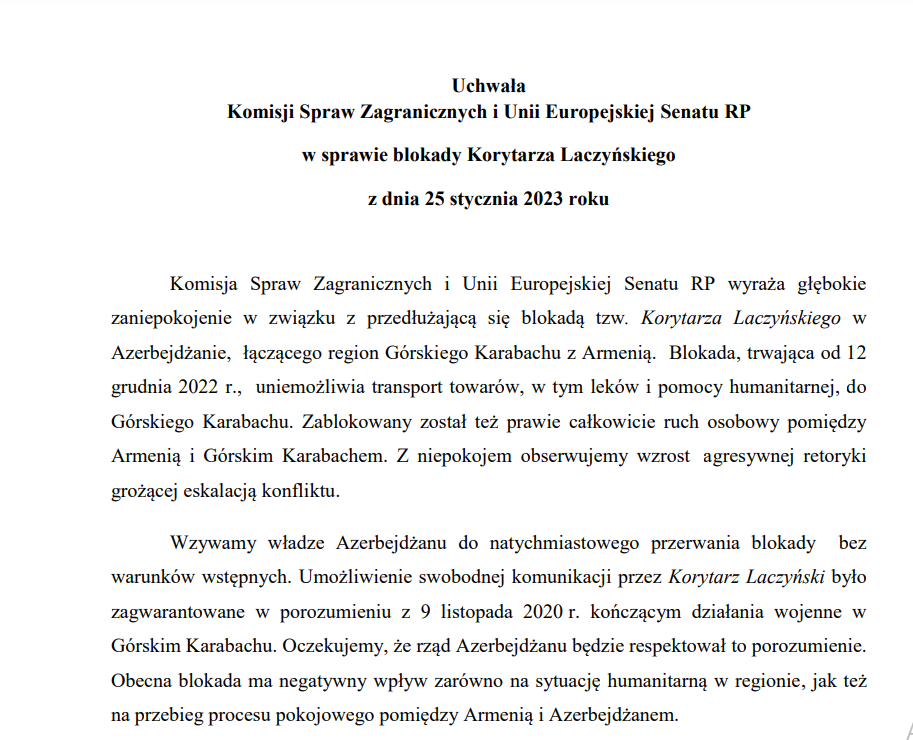 🇵🇱 Комитет по иностранным делам и делам ЕС Сената Польши принял резолюцию, призывающую Азербайджан «разблокировать» Лачинскую дорогу (сайт Сената Польши).