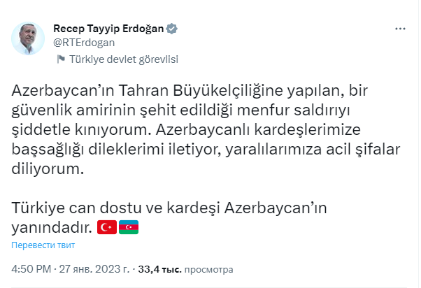 🇹🇷🇦🇿 Эрдоган осудил «чудовищное» нападение на посольство Азербайджана в Тегеране (Twitter-аккаунт Эрдогана).