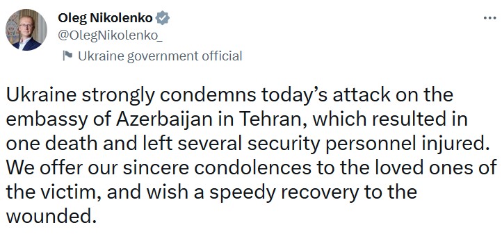 🇺🇦🇦🇿 МИД Украины осудил нападение на посольство Азербайджана в Иране. Об этом заявил пресс-секретарь МИД Николенко.